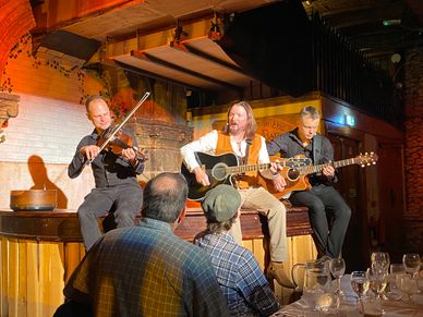 Back on the bus for a 40 minute ride to a famous pub/hotel that has been around since 1640. Bus loads of groups arrived, There were at least 8 long tables seating 20 each where a fab dinner was served. I had traditional Irish stew which was great. A moussy apple desert was melt in your mouth . Then the show began. It had the traditional Irish dancers a great singign group and a singer from Celtic Women.
