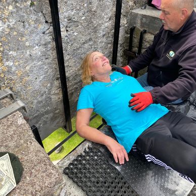 Chek out way above my right shoulder. That hole near the top is where that stone lie,and you have toliterallybend over backwards to give it alittle peck. Luckily there is some assistance provided.